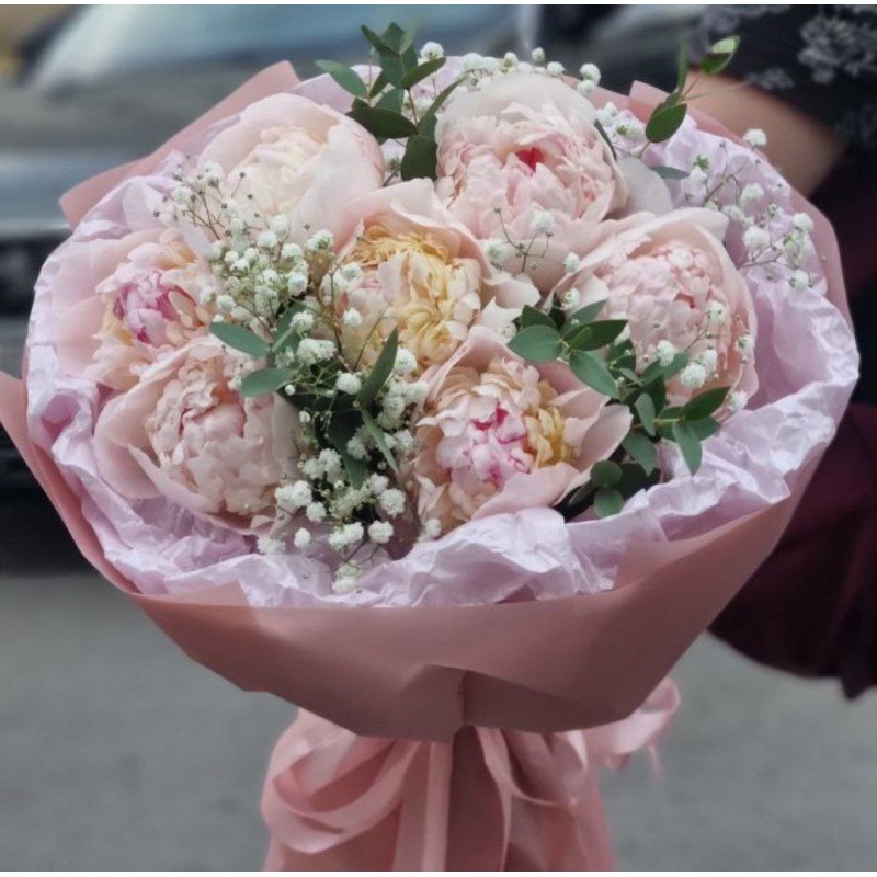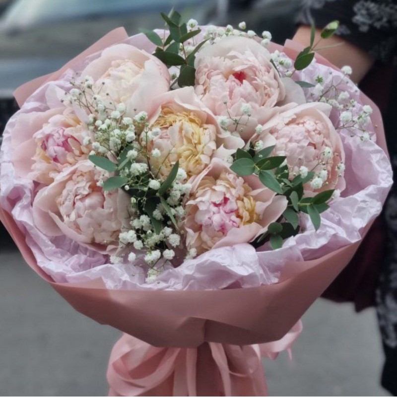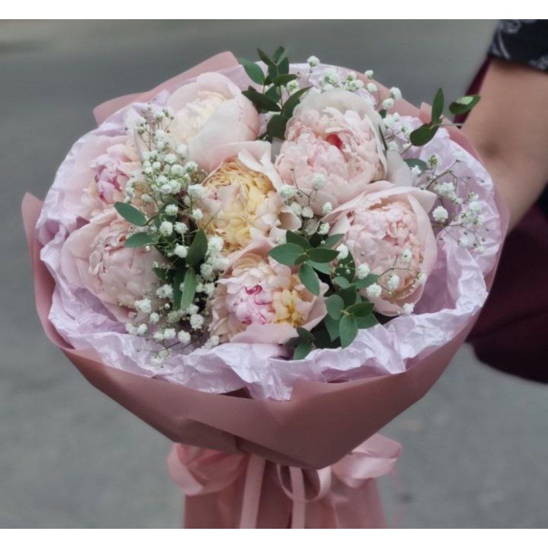 7 пионов (цвет может быть другой), гипсофил, зелень, упаковка