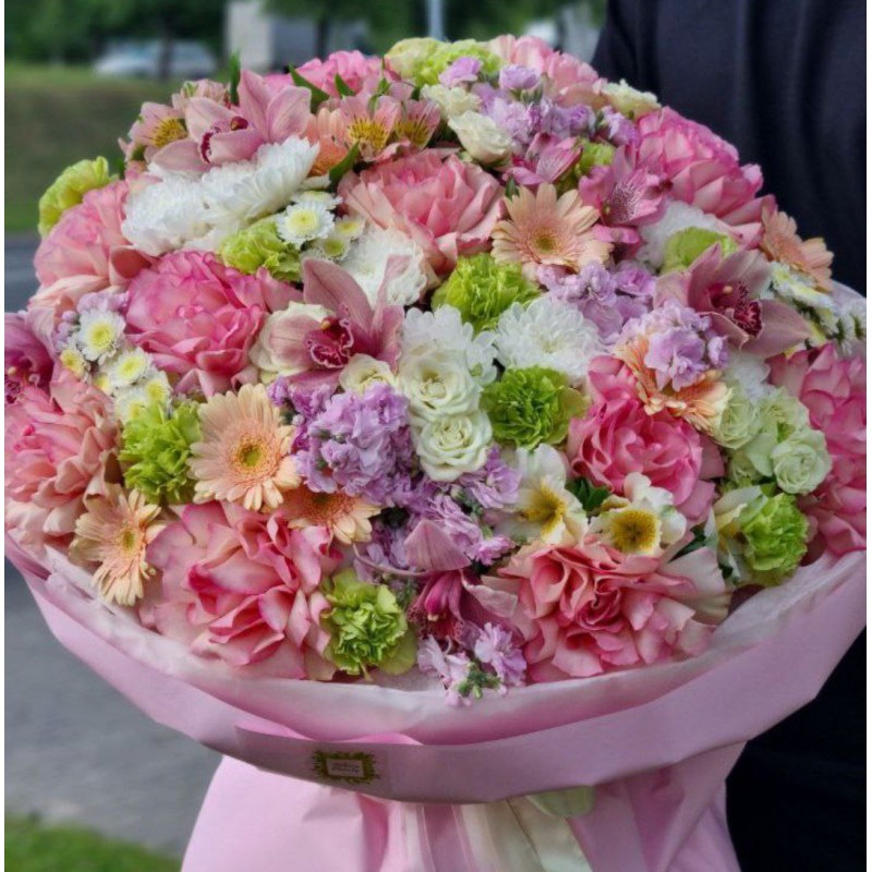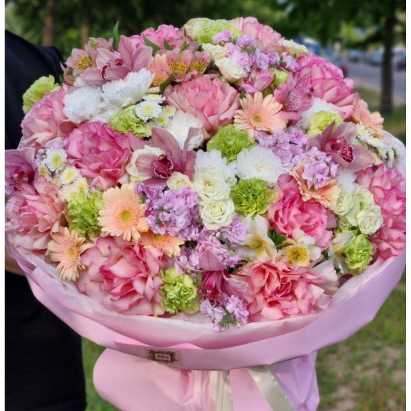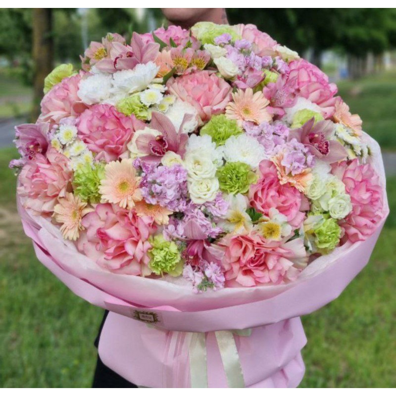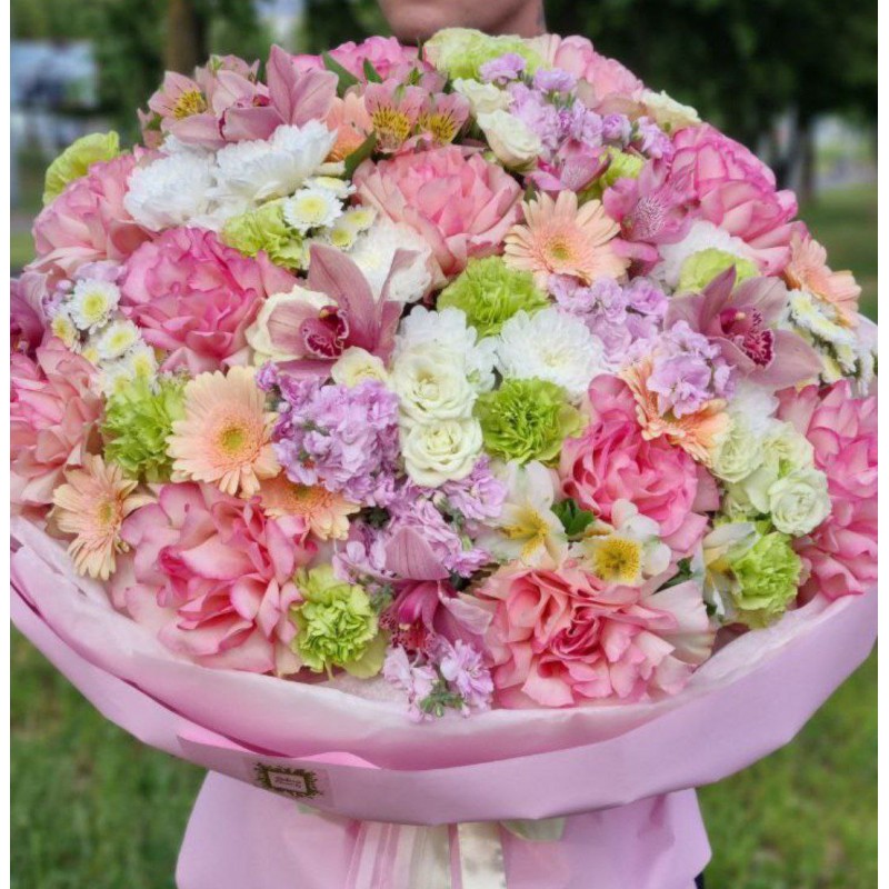 11 французских роз, 8 кустовых роз, 5 хризантем, 5 орхидей, 5 матиол (сезонный цветок, возможна замена), 8 альстромерий, 11 диантусов, 7 гербер, упаковка