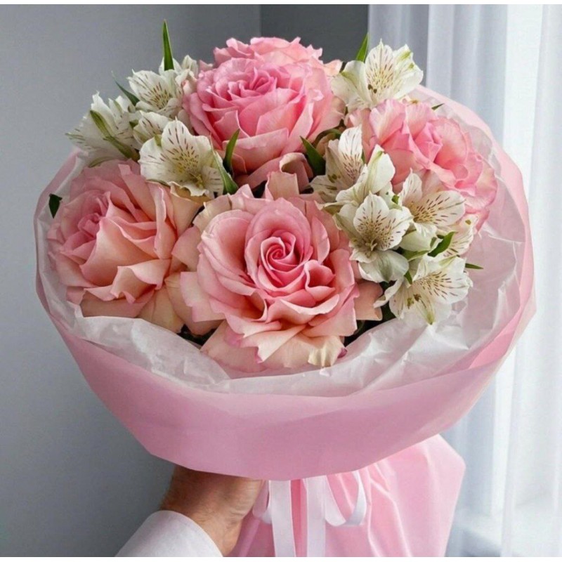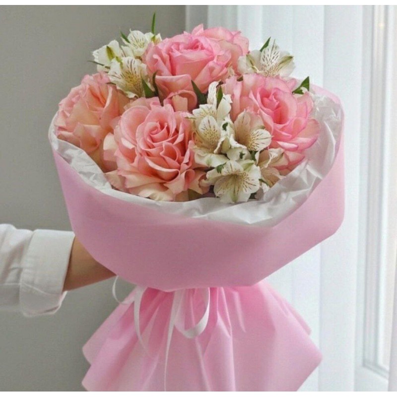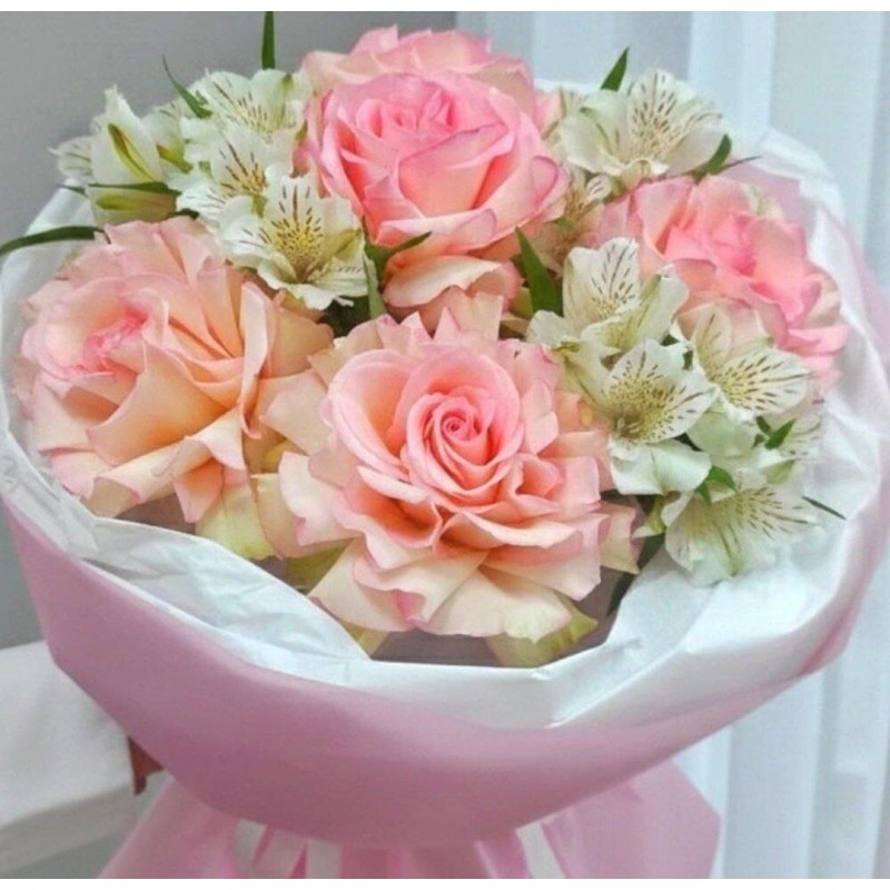 5 французских роз, 4 альстромерии, упаковка