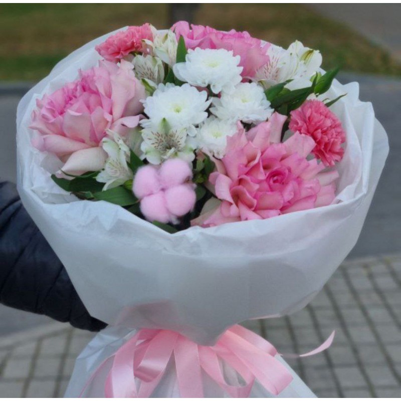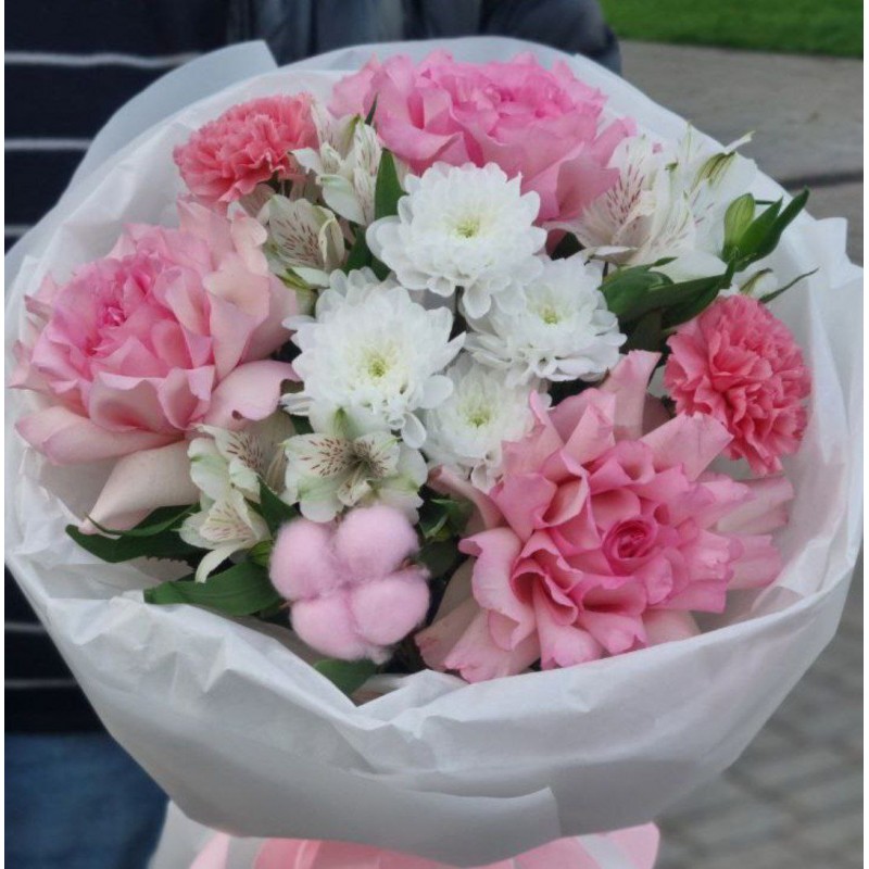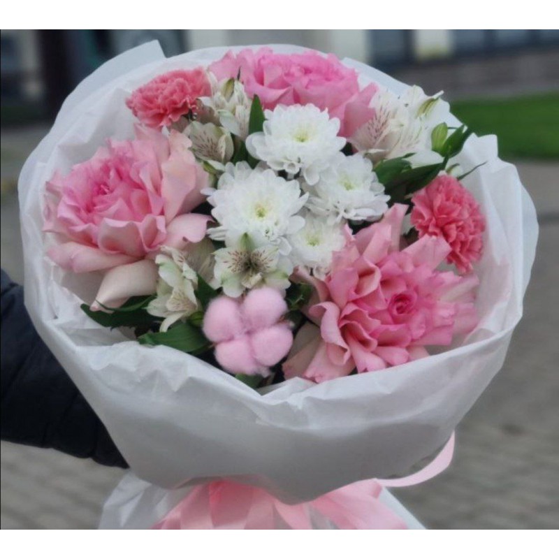 3 французские розы, 3 альстромерии, 1 хризантема, 2 диантуса, 1 хлопок, упаковка
