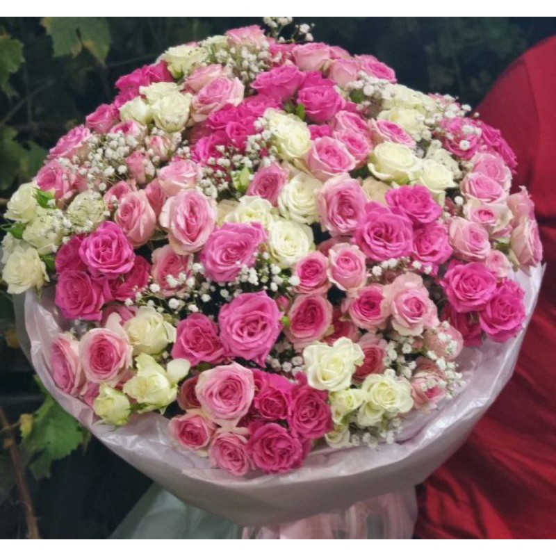 35 кустовых роз, 2 ветки гипсофила, упаковка