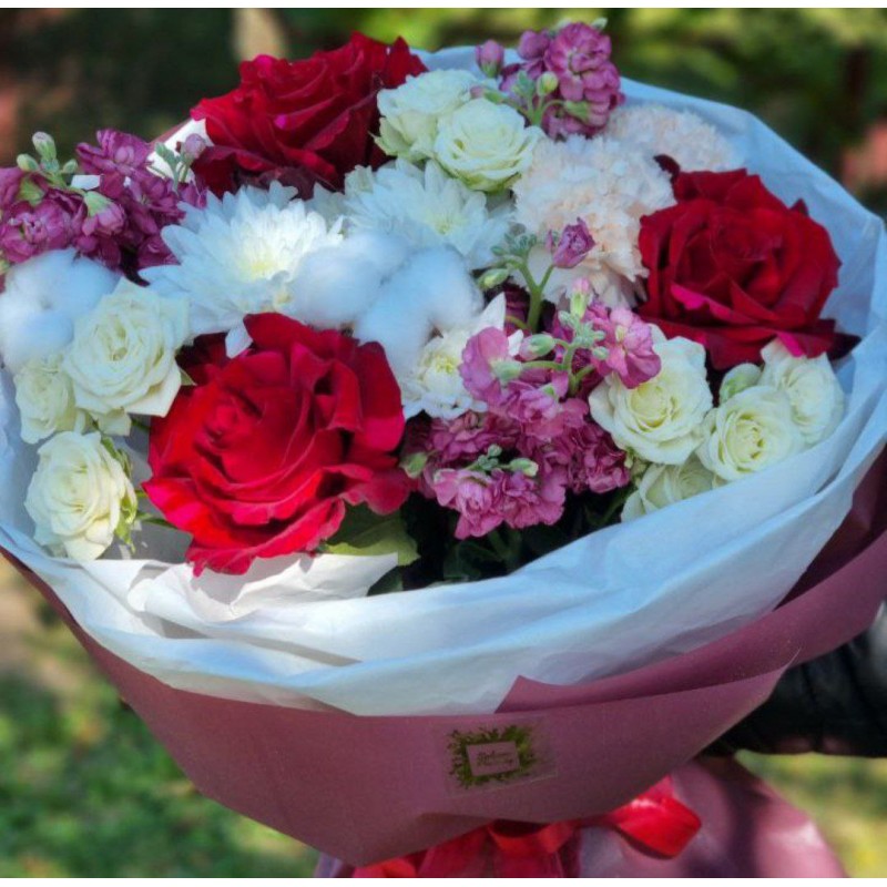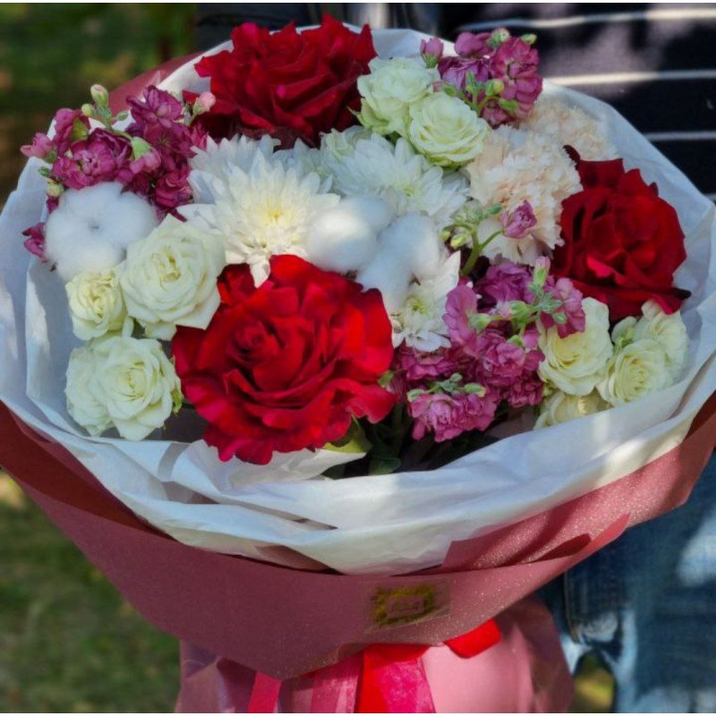 3 французские розы, 1 хризантема, 3 матиолы (сезонный цветок, возможна замена на альстромерию), 3 кустовые розы, 2 диантуса, 2 хлопка, упаковка